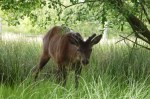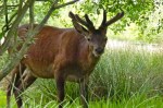 May 28th – Pottering around Chasewater, from Pool Road, I noticed deer over by the old spoil heap to the rear of the disused Highfield Farm. They were too far away to get a decent picture, so I entered the park, crossed back over the toll road via the footbridge and hopped onto the old railway line at the back of Poole Crescent. I came face to face with the group of red deer – two hinds and two young stags, with antlers still in velvet – just by the marsh at the corner of the heap.