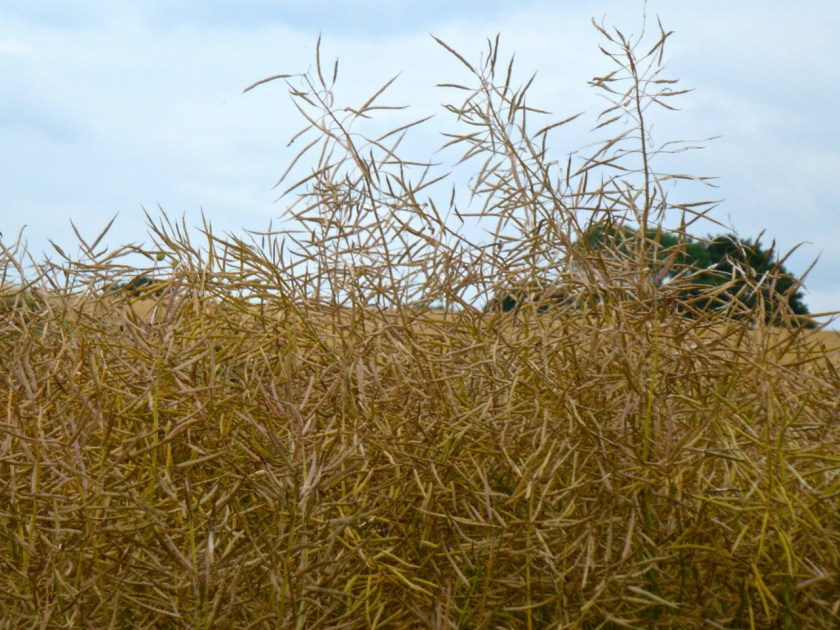 July 20th – Usually forgotten after it’s dramatic yellow flowering phase, the oilseed rape is nearing ripeness. People often think the scruffy, dead looking spiky plants are failed crops – but each of the fine pods contains numerous small black seeds that contain a rich, high-energy oil, useful for food and biofuel. The crop is harvested and flailed by combine harvester, the seeds taken away for pressing. A very modern crop.