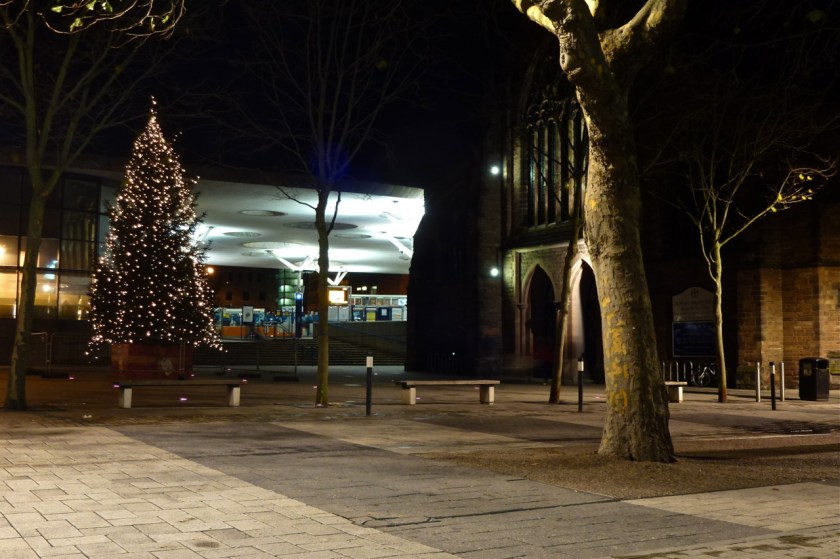 November 29th – Walsall is an odd place architecturally. I love The Crossing at St. Paul’s – the former church cum shopping centre, and the wee piazza outside it where the Christmas tree sits. I don’t mind the bus station – at night, you can see what the architect was getting at. It’s all beautifully lit up… but the paving, the mixture of slate and pale grey granite composite blocks, arranged into stripes, to me at least is horrid. Further into what’s now known as ‘The Civic Quarter’ – ‘We ay pretentious, we’m not’ – there are the most horrid street lighting columns I have ever seen. I think the street furniture and paving – which clash, eye-jarringly – were purchased and some kind of urban designers fire sale. Walsall, on a civic level, does this sort of thing with alarming regularity. Weird.