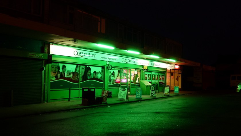 January 8th – I rested today. The 40 miler I cycled the day before had probably been a bit over-ambitious. I needed to rest, and the stomach was still a bit troublesome. I’d wanted to explore industrial areas at night for a while, and headed off to Aldrige to see what I could find at 5pm. On the way, I passed the Costcutter store on Salters Road. That is some extreme green lighting. I wonder if it serves a purpose, or if it’s just there for effect? It’s bloody hideous, frankly.