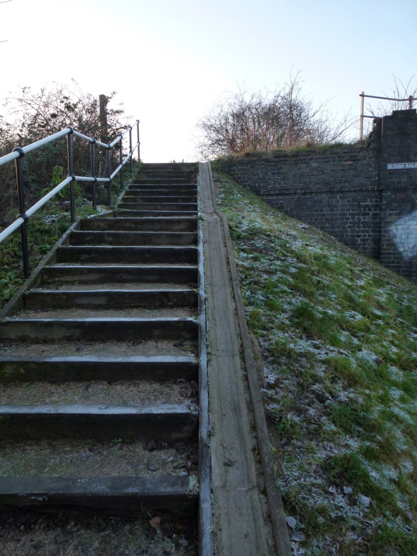 January 15th – I have to keep rolling. Despite feeling a bit grim, I embarked on a chilly ride around Brownhills, Chasewater and Hammerwich. The ice tyres made short work of the icy puddles and frozen track mud, and it was quite a blast. As I approached what has now been christened ‘Slough Railway Bridge’ in a sudden fit of bridge nameplate renewal by British Waterways, I noted something I’d been meaning to feature here for a while. Many folk don’t realise what the channel on the right of this flight of steps is for – it’s to push your bicycle up to the cycle track above from the towpath below. It’s only been installed in the last few years, and certainly makes the climb easier, and provides a trick challenge for the BMX kids. I see more an more of these about, and a fine thing they are, too.