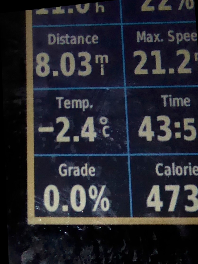 January 13th – Now, this is winter at last. Riding homeward at 6pm, the air temperature according to the ride computer was -2.4 degrees C. It felt it too.