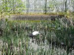 May 5th – This one has me a bit puzzled, and makes me realise how little I know about swan behaviour. This lone swan is on the decaying nest left in the disused basin by Cashmores works just off the Walsall Canal at Pleck. This nest successfully incubated and hatched at least four cygnets last season to a pair who I think are now nesting up at Bentley Bridge. The nest here is very secure from most predators – well out on the water, and humans can’t get there as it’s almost totally fenced off.