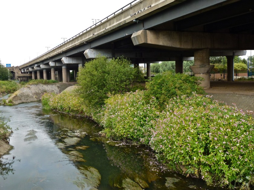 July 27th – Getting of a Walsall train at Bescot, I lugged the bike over the mountainous footbridge and over the river Tame onto Bescot Cresent. Here, the formerly dirty, polluted river runs clean and is lined with greenery. The Ford Brook, which I commented on yesterday, flowing down the Goscote Valley, is a tributary to the Tame and shares the same issue with the invasive, alien plant Himalayan Balsam. Here, it grows tall and dense in the detritus at the side of a concrete culvert. The tinny, metallic smell of the flowers is very strong here, as it will be in lots of damp spaces for the coming month or so.