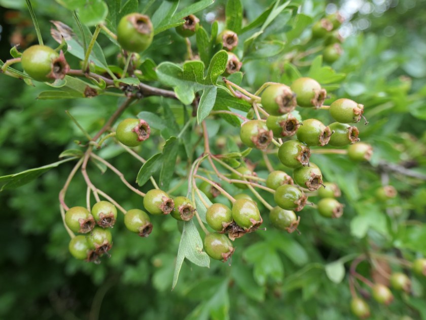 Starting with cherries and rowan berries, fruits, nuts, haws, hips and seeds are now developing well. The green hawthorn berries are plentiful this year after a thin year last time; and blackberries look like they’ll be in good supply too.