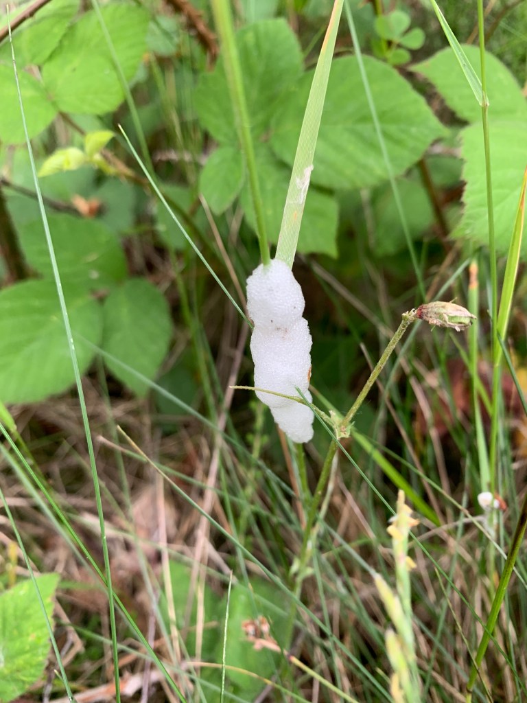 The goo is actually the protective coating on the nymph of the froghopper bug, which is noted for its prodigious jumping ability. The adults lay their eggs in late summer, which overwinter in plant stalks. As the nymphs hatch, they produce a bitter, foamy liquid as a byproduct of sucking plant sap, which then surrounds them and protects them from harm until they become fully grown.