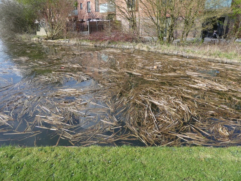 Lots of reed detritus and airborne blossom debris is combining, as it does at various times of the year, to form a heavy scum in wind traps on the surface of the water.