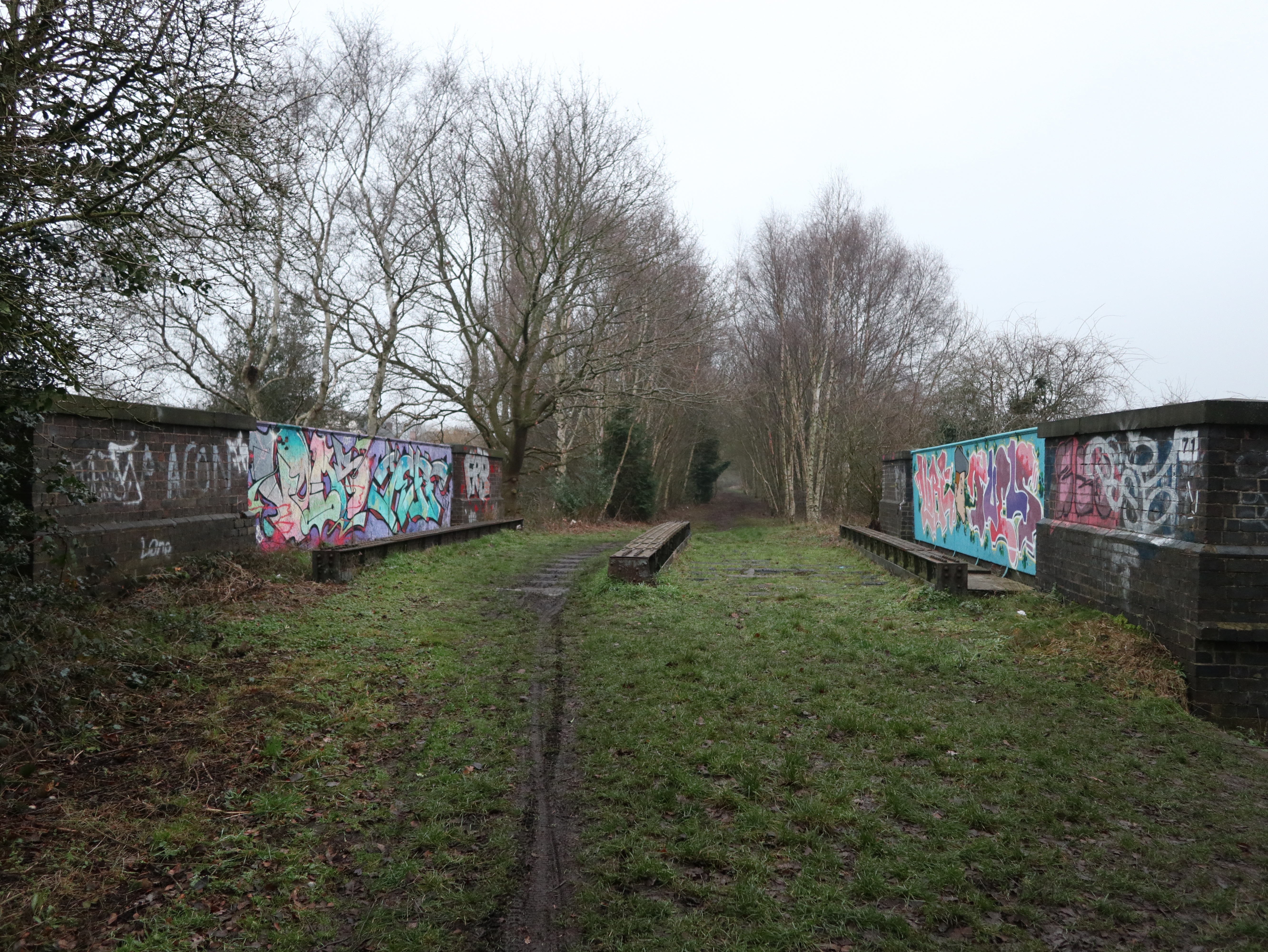 Clayhanger Marsh, which the trail is embanked above, was brooding and deathly quiet, and I didn’t;t see another soul. The only colour was from the graffiti on the old railway over bridge at the Wyrley and Essington Canal near the Pelsall Road.