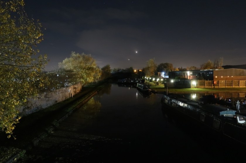 As I ploughed back towards Brownhills – the towpaths were hard going, not with ice, but unrelenting mud and sludge – I thought I’d have a go at Clayhanger Bridge with the Panasonic. Not too bad considering the lack of moonlight. A lot of colour in a very dark scene. I liked it.