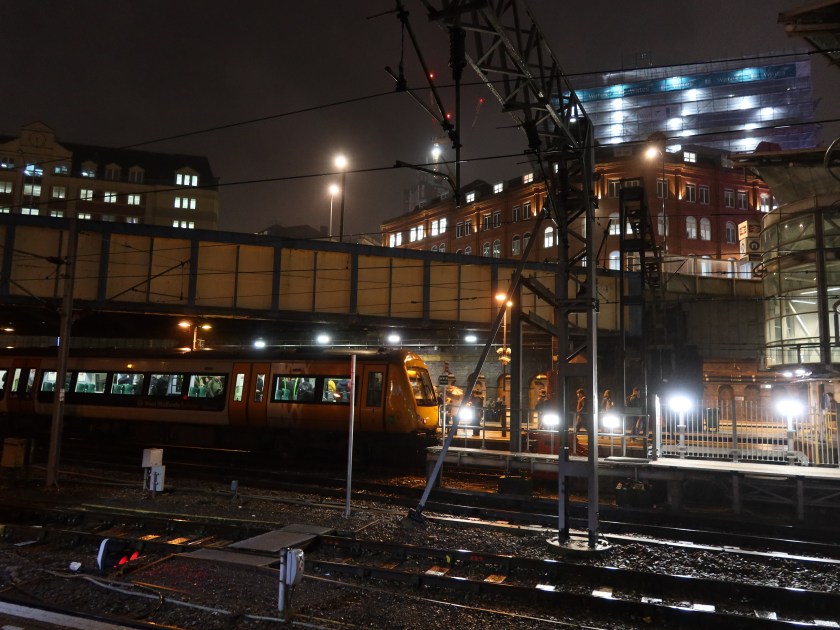 It was while downing a double espresso to pep me up for the push from Four Oaks that I took time admiring the night view of metalwork, lights and machinery from under the access bridge on platform eight.