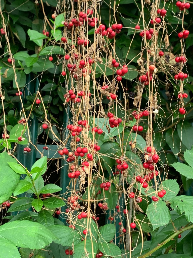 September 14th – In a hedgerow by the towpath in Walsall Wood, a creeper drapes pretty red berries on long, dying tendrils.