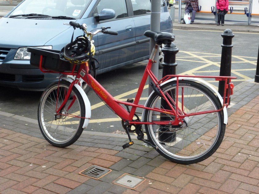 February 28th – Unusually, I passed through Aldridge on my way to work today. While popping into the shopping centre, I noticed a Royal Mail bike parked up near Anchor Road. These are a longstanding design, manufactured by Pashley in the UK. They weigh a ton, but have lots of solid, dependable tech – hub brakes and gears by Sturmey Archer, step through frame, Scwalbe marathon plus puncture resistant tyres, and dutch-style wheel lock on the rear, as well as the all important sturdy rack and front tray. Sadly, these bikes could be a passing tradition, as the wonks at the Royal Mail are apparently considering discontinuing the use of bicycles. Idiots.