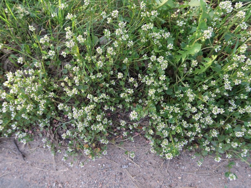 One odd thing is the white plant flowering at the edge of the verges; this tiny flower is Danish scurvy grass, a formerly coastal flower that thrives beside main roads in the salty soil caused by winter gritting.