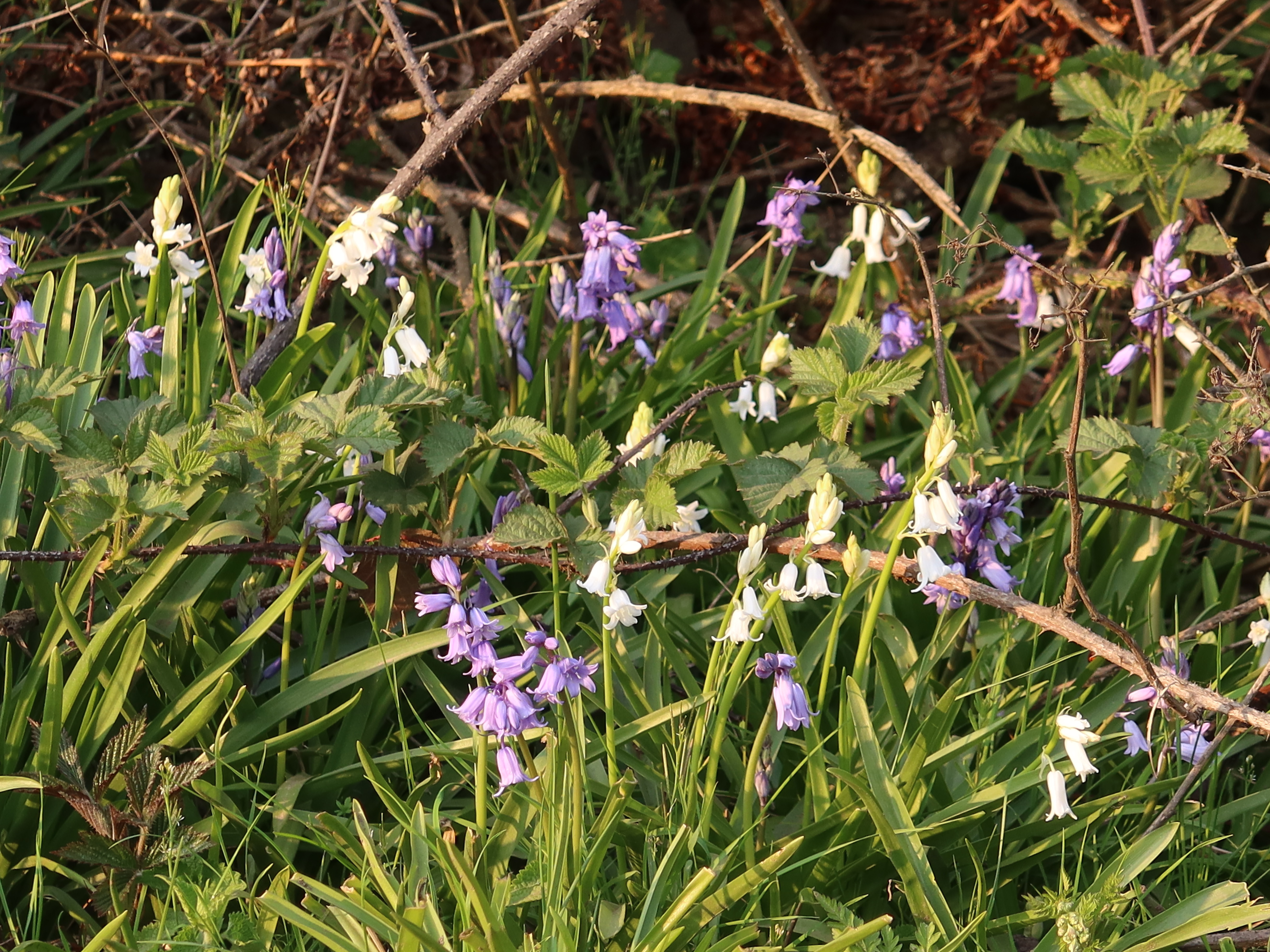 In the last day, the Spanish bluebells had come out in the hedgerow near Fishpond wood, and as usual with this colony they ranged in shade from blue, to pink, to white.