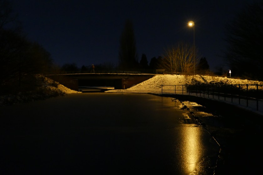 Coming home on the canal, I thought I’d try my old muse Clayhanger Bridge in the snow. For some reason I’m having real trouble getting this bridge at night with the current camera. I just don’t think the software in the device knows what to do with the image.