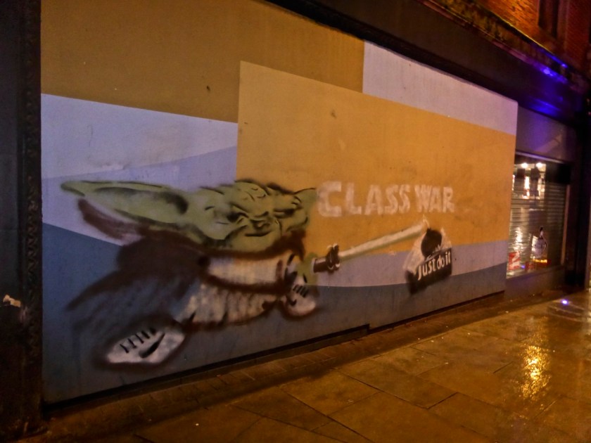 It’s beautifully executed, and seems to be by the same hand as the now erased ‘Class War’ stencil that was nearby until very recently. The art is confident yet cursory, and beautifully thought out.