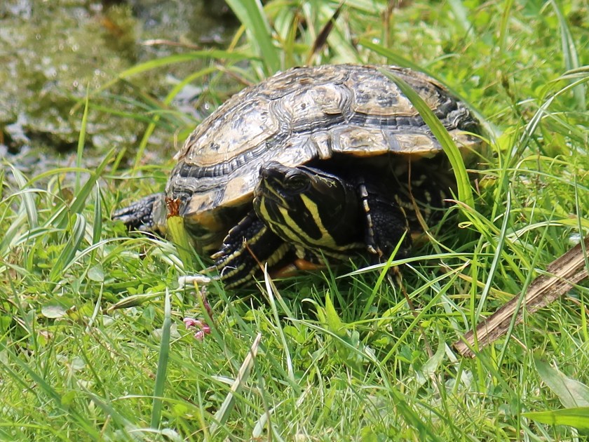 Clearly a discarded pet, many canals and pools in the UK are home to these gentle, but surprisingly speedy vegetarians. The will live happily in our climate although being native to the Americas, but will not breed, even if they managed to find a mate. These turtles were popular a while back and sold as small animals, many were set free as they grew.